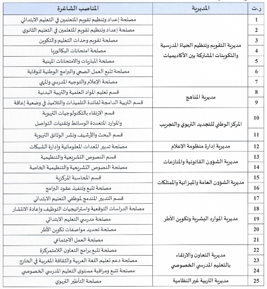 قرار لوزير التربية الوطنية والتكوين المهني والتعليم العالي والبحث العلمي في شأن الترشيح لشغل مناصب المسؤولية الشاغرة بالإدارة المركزية لقطاع التربية الوطنية، ويتعلق الأمر ب25 منصب تتوزع كالتالي: