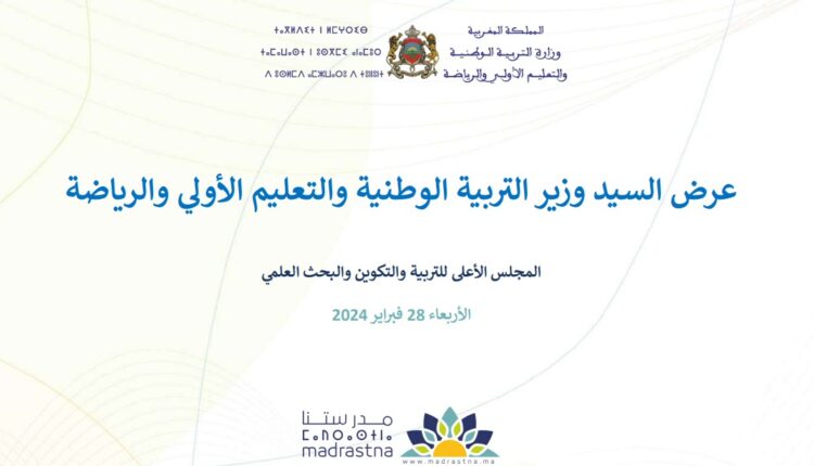 عرض السيد وزير التربية الوطنية والتعليم الأولي والرياضة بتاريخ الأربعاء 28 فبراير 2024 خلال أشغال الدورة الرابعة للجمعية العامة للمجلس الأعلى للتربية والتكوين والبحث العلمي، المنعقدة بمقر المجلس بالرباط. حيث تم تقديم عرض مفصل حول أهم مستجدات المنظومة التربوية وبعض الإجراءات الإصلاحية التي تنكب الوزارة على تنفيذها.