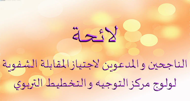 السلام عليكم، و هنيئا لكل الناجحين و المدعوين لاجتياز المقابلة الشفوية لولوج مركز التوجيه و التخطيط التربوي، و نتمى قدرا يشمل نجاحا بهذا المركز للآخرين مستقبلا ان شاء الله، تجدون أسلفه لائحة خاصة بكل شعبة -تعتبر استدعاءا- هو مقسم باللوائح حسب تاريخ إجراء المقابلة الشفوية يومي 4 و5 مارس2019، نتمنى كل التوفيق للجميع