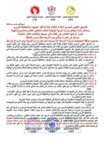 أمام تجاهل وزارة التربية الوطنية للملف المطلبي العادل و المشروع لأطر التوجيه والتخطيط التربوي، فإن التنسيق النقابي الموسع FNE (التوجه الديمقراطي) CDT FDT لأطر التوجيه و والتخطيط التربوي يستنكر هذا التجاهل كما يدعو إلى إضراب وطني يوم الأربعاء 20 مارس 2019، مصحوبا بوقفة احتجاجية أمام وزارة التربية الوطنية بباب الرواح بالرباط، البيان أسفله: